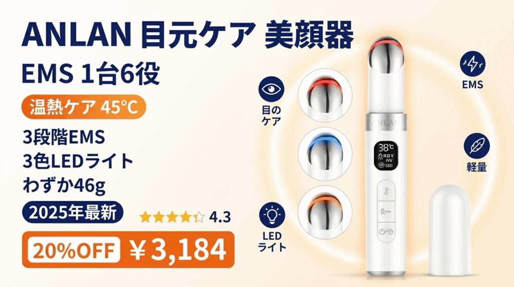 ANLAN 目元美顔器を徹底レビュー!1台6役(温熱・EMS・LED・振動)で目元・口元を集中ケア。38〜45℃温度調整、3段階EMS、わずか46gの軽量設計。ヤーマン・パナソニックとの比較、メリット・デメリット、口コミを解説。BF20%OFF¥3,184。