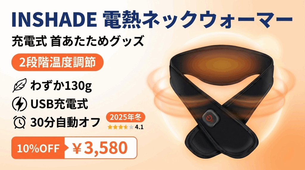 INSHADE 電熱ネックウォーマーを徹底レビュー!充電式で繰り返し使える防寒グッズ。2段階温度調節、わずか130g、30分自動オフ機能搭載。通勤・アウトドア・農作業・就寝時に最適。他社比較、メリット・デメリット、口コミを解説。BF10%OFF¥3,580。