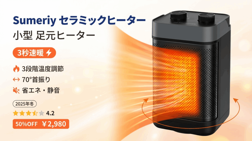 Sumeriy セラミックヒーターを徹底レビュー!3秒速暖、3段階温度調節、70°首振り機能で足元ぽかぽか。省エネ・静音・過熱保護・転倒オフ機能搭載。他社比較、メリット・デメリット、電気代、口コミを解説。BF50%OFF¥2,980の超お得価格。