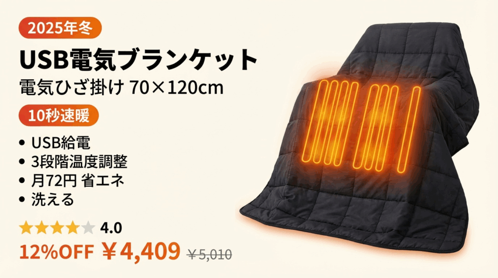 USB電気ブランケット(電気ひざ掛け)を徹底レビュー!10秒速暖、USB給電、3段階温度調整で月72円の省エネ暖房。デスクワーク・車中泊・アウトドアに最適。コンセント式との違い、メリット・デメリット、電気代を解説。BF12%OFF¥4,409の高コスパ。