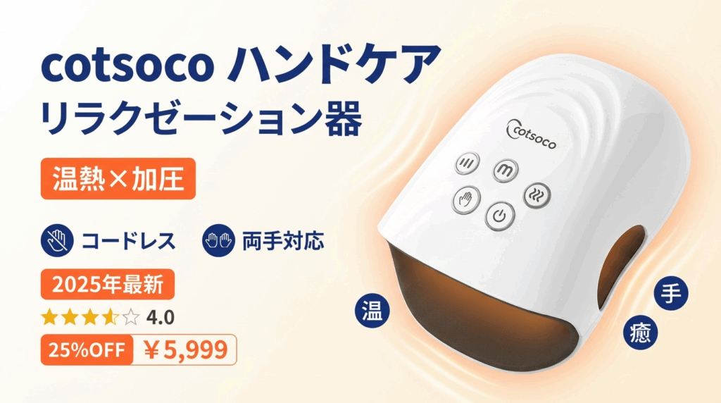 cotsoco ハンドケアを徹底レビュー!温熱×加圧マッサージで手の疲れをリフレッシュ。コードレスで使いやすく、デスクワークやスマホ疲れに最適。NIPLUX・ATEXとの比較、メリット・デメリット、口コミを解説。BF25%OFF¥5,999。