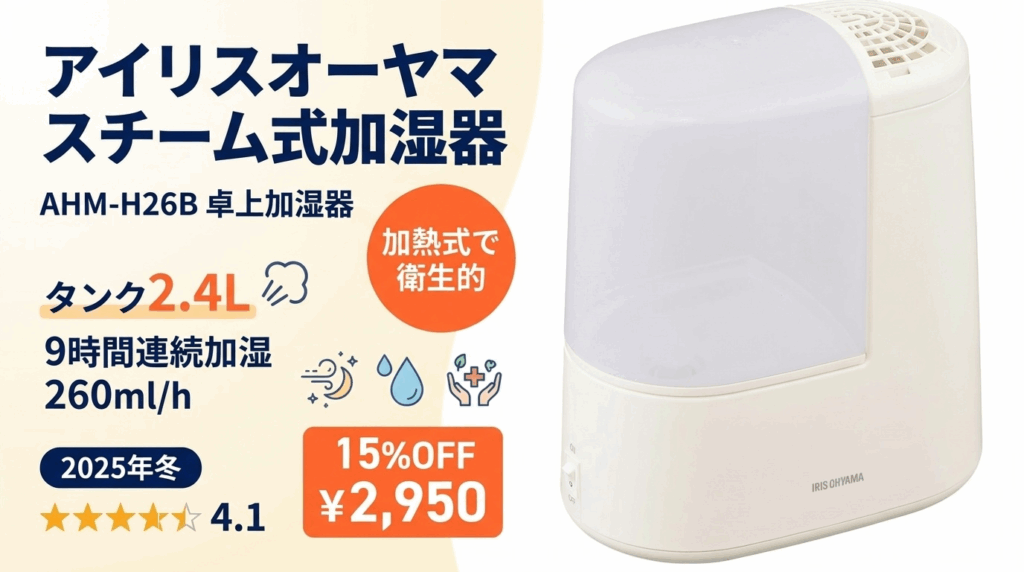 アイリスオーヤマ スチーム式加湿器 AHM-H26B を徹底レビュー!加熱式で衛生的、タンク容量2.4L、9時間連続加湿。超音波式との違い、メリット・デメリット、電気代、口コミを解説。BF15%OFF¥2,950の高コスパ。